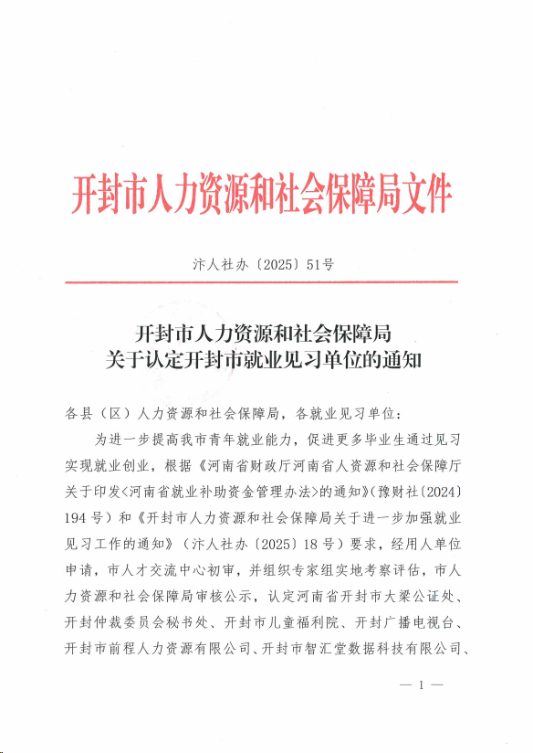 今年7月,依据《河南省财政厅 河南省人力资源和社会保障厅关于印发<河南省就业补助资金管理办法>的通知 》(豫财社〔2024〕194号)以及《开封市人力资源和社会保障局关于进一步加强就业见习工作的通知》(汴人社办〔2025〕18号)的要求,经过用人单位申请、市人才交流中心初审,以及专家组对见习场所、管理制度、师资配备、经营管理等多方面的严格考察评审,开封市智汇堂数据科技有限公司成功被认定为开封市市级就业见习单位。成为就业见习单位后,公司将为离校两年内未就业高校毕业生以及16—24岁登记失业青年提供宝贵的就业见习岗位,助力青年群体提升就业能力,积累工作经验。