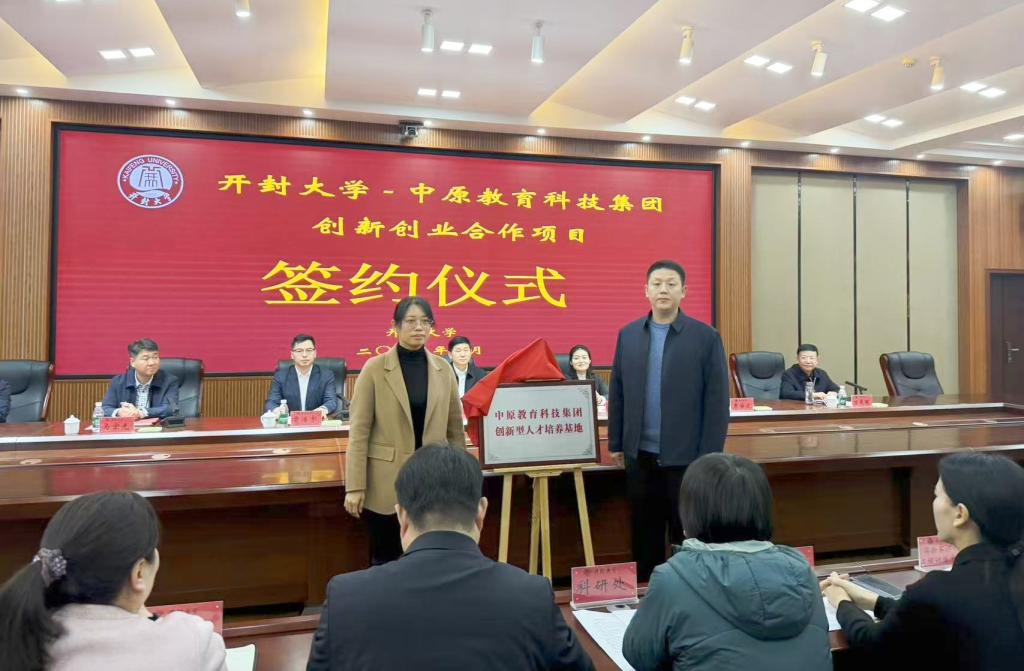 王德如校长在讲话中指出,近年来,开封大学将创新创业教育作为教育教学改革的“突破口”以及提升人才培养质量的“提升器”,系统构建了独具特色的创新创业教育体系。与中原教育科技集团的合作,标志着学校创新创业教育实现了从“校内自主培育”到“校社协同赋能”的重要转变。贾浩宇表示,本次“政校企”三方联动,是各方积极响应“我敢闯,我会创”的双创号召、深化产教融合的具体实践,也是为开封培育本土创新人才、注入创业活力的务实之举。马宏光代表开封市人社局对此次合作表示热烈祝贺。他表示,本次签约是落实全市就业创业工作部署、激发青年创新活力的生动实践。市人社局将在政策上给予支持、资源上做好对接、服务上持续跟进,全力支持合作项目持续推进。李治副校长与贾浩宇董事长共同签订了合作协议,开封大学创新创业学院院长李辉与河南京腾职业培训学校校长李海波为“中原教育科技集团创新型人才培养基地”揭牌,万是明宣布“开封大学2025年首期网络创业培训班”正式开班。