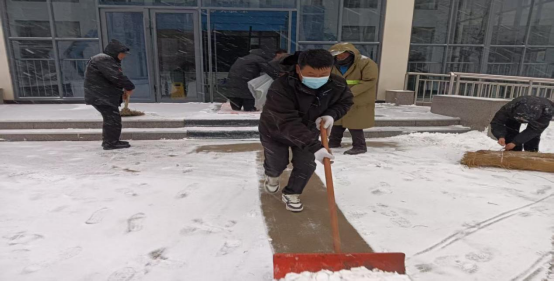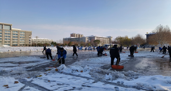 13日,深弘物业安排在岗人员肃清道路积雪,工作人员不怕苦、不怕累、不畏严寒,奋战一线。高效恢复道路畅通,用昼夜坚守筑牢师生出行安全防线。