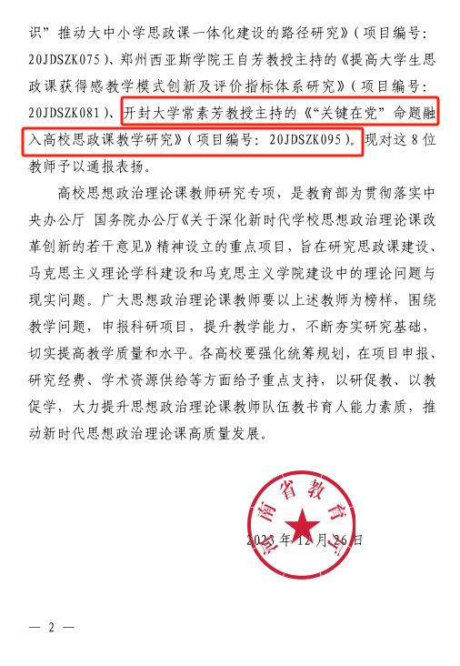 本站讯 近日,教育部社科司印发了《关于高校思想政治理论课教师研究专项2023年结项情况》,通报了高校思想政治理论课教师研究专项2023年结项情况,经专家评审,社科司审核,评出优秀成果8项,合格成果81项。我校常素芳老师主持的《“关键在党”命题融入高校思政课教学研究》和我省其他7个项目顺利通过验收,河南省教育厅对此予以通报表扬。