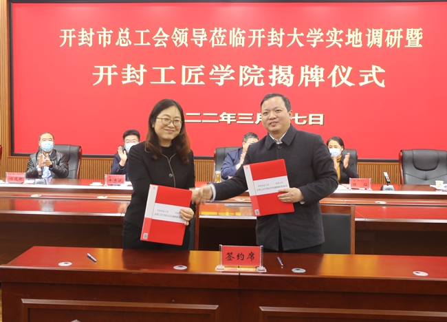 3月17日上午,“开封工匠学院”揭牌仪式在我校举行。开封市人大党组副书记、副主任、工会主席胡荣启,市总工会党组书记、常务副主席牛彦斌,市总工会党组成员、副主席张红,市总工会党组成员、副主席胡宁和我校党委书记陈灿,党委副书记储建新,党委委员、副校长赵辉,党委委员、卫校党委书记曾小平共同出席了签约揭牌仪式。仪式由校党委委员、工会主席成芳主持。