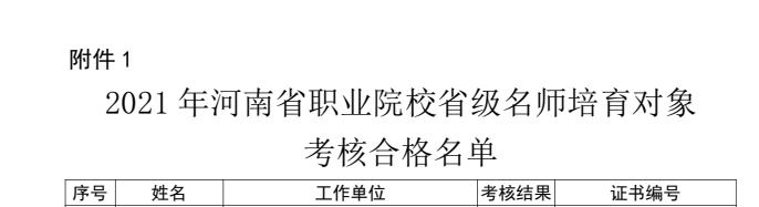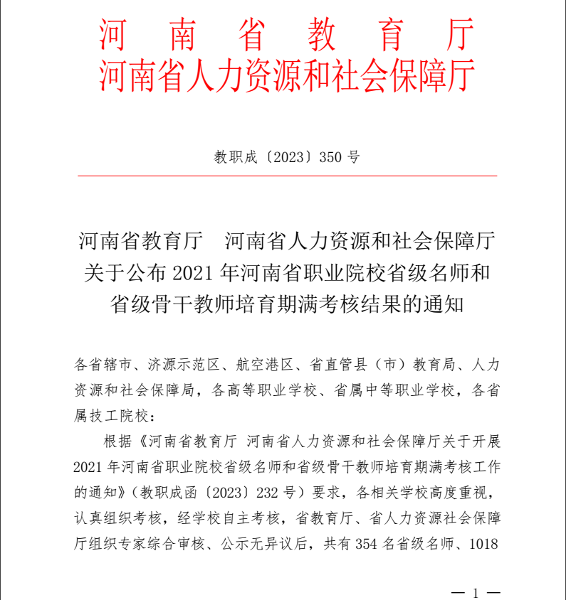 本站讯 10月20日,河南省教育厅办公室发布《关于公布2021年河南省职业院校省级名师和省级骨干教师培育期满考核结果的通知》,经学校自主考核,省教育厅、省人力资源社会保障厅组织专家综合审核,公示无异议后,我校省级名师李治、师兆忠、李军、赵书锋考核合格,省级骨干教师李响、刘悦、王晓婷、边疆、蒋大山、李林考核合格。