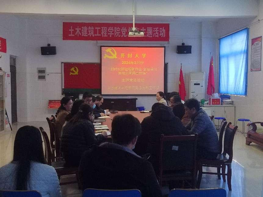 为推动学习贯彻习近平新时代中国特色社会主义思想主题教育走深走实,凝聚全体党员思想共识,激发干事创业的奋进力量,3月14日,土木建筑工程学院教工党支部在学院五楼会议室组织召开了“新时代新征程新伟业·全面学习贯彻全国两会精神”主题党日活动,会议由教工第二党支部书记郭瑞主持,全体教工党员参加。