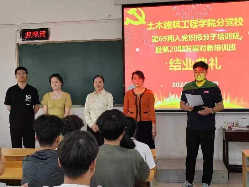 5月22日中午,土木建筑工程学院在3#楼101教室举行第69期积极分子培训班暨第20期发展对象培训班结业仪式。学院党总支书记李春霞出席,学生党支部书记赵文婷、党总支组织委员徐喆、学生支部宣传委员王淑明参加,活动由学生支部组织委员王巍智主持。