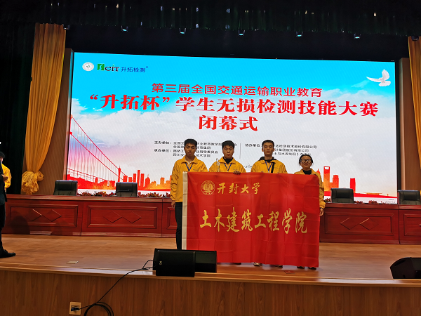近日,第三届全国交通运输职业教育“升拓杯”学生无损检测技能大赛在四川省成都市落下帷幕,经过几天激烈角逐,我校土木建筑工程学院李君和王朝锋老师指导的学生郑笑燃、杨涛、韩琬琼、项春豪获得单项二等奖一项、单项三等奖两项、团体三等奖一项的优异成绩。