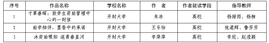 根据《河南省教育厅等五部门关于举办第18届河南省“诚信校园行”学生资助宣传教育活动的通知》文件精神,我校组织开展了2025年“诚信校园行”学生资助宣传教育活动,进行了征文作品征集和评选,学生资助管理中心共收集到作品299份,经学院评选推荐、学生资助管理中心初选、学工委评审等,拟推荐3份优秀作品参加河南省“诚信校园行”学生资助宣传教育活动,现予以公示。