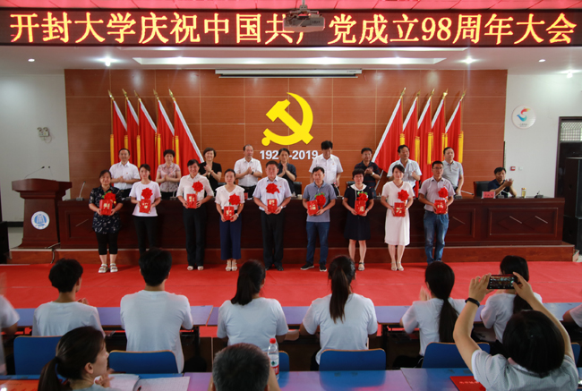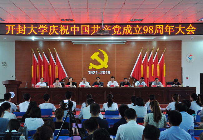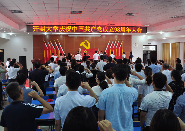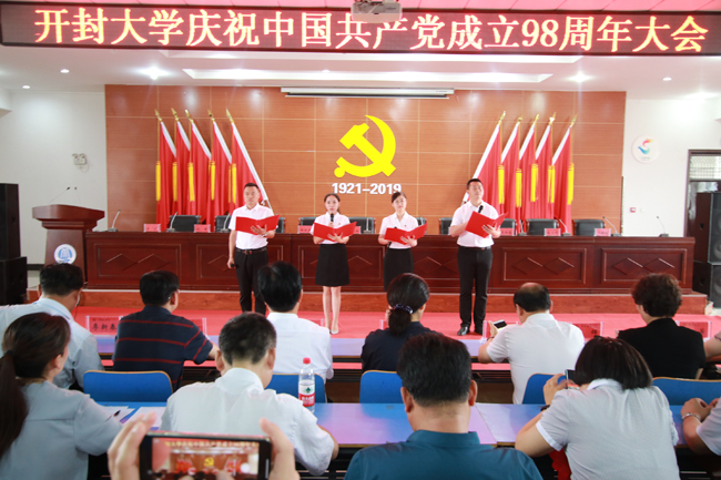 会议在雄壮激昂的国歌声中拉开序幕。我校党员教师丁召彬、胡蓓晖、王静、秦新峰的配乐诗朗颂表达了广大师生党员对党的歌颂和热爱。与会人员观看了2018-2019学年开封大学党建工作巡礼及《向党的生日献礼--开封大学庆祝中国共产党成立98周年寄语》视频。