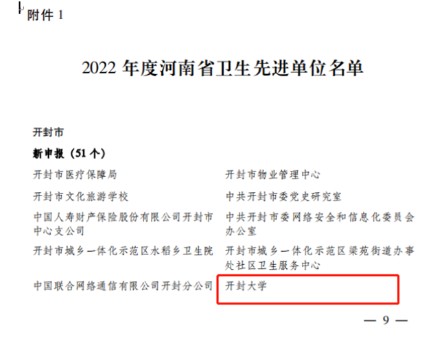 本站讯 近日,我校被河南省爱国卫生运动委员会授予“2022年度省级卫生先进单位”荣誉称号。