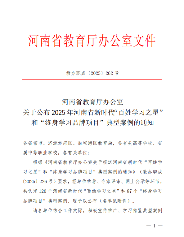 近日,河南省教育厅公布了2025年河南省新时代“百姓学习之星”和“终身学习品牌项目”典型案例名单。我校申报的“弘扬工匠精神,助力终身学习——开封工匠学院”项目成功入选典型案例名单。