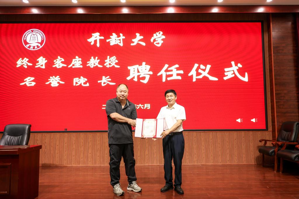 本站讯 6月26日,开封大学举行聘任仪式。人工智能顶尖科学家张军被聘为终身客座教授和信息工程学院名誉院长。王德如校长为张军颁发聘书。