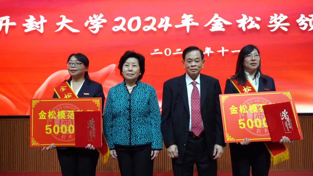 2024年11月12日上午,开封大学隆重举行2024年“金松奖”颁奖大会。中国侨联常委、世界客属总商会主席、香港中原华商总会主席、金心集团董事局主席、开封大学董事会董事长李金松,钧帝国际集团总经理、开封大学董事会副董事长赵奎荣,开封市人民政府副市长刘震,校党委书记谭贞、校长王德如,开封市人民政府副秘书长陈学辉出席大会并为获奖师生颁奖。